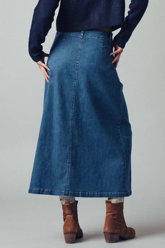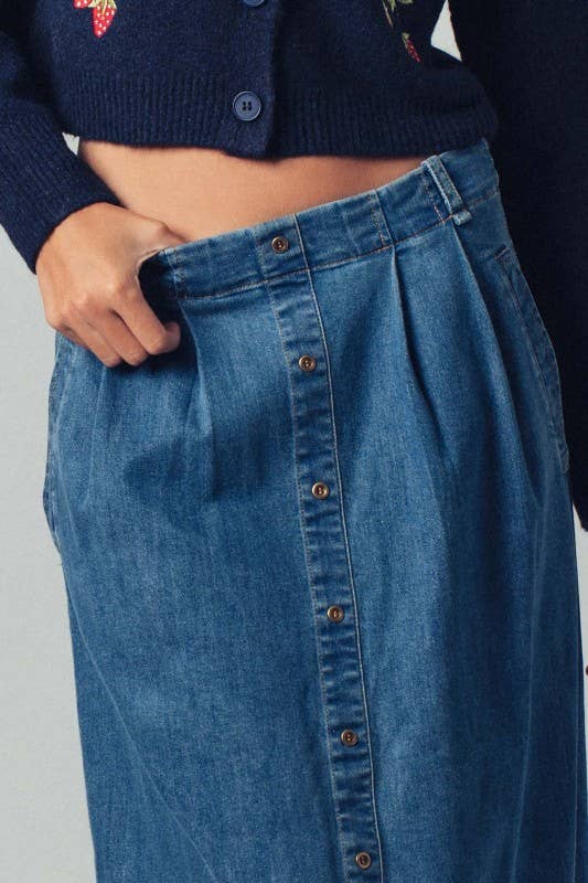 Full button-front design • Side pockets • Sits at the natural waist with a relaxed A-line silhouette.