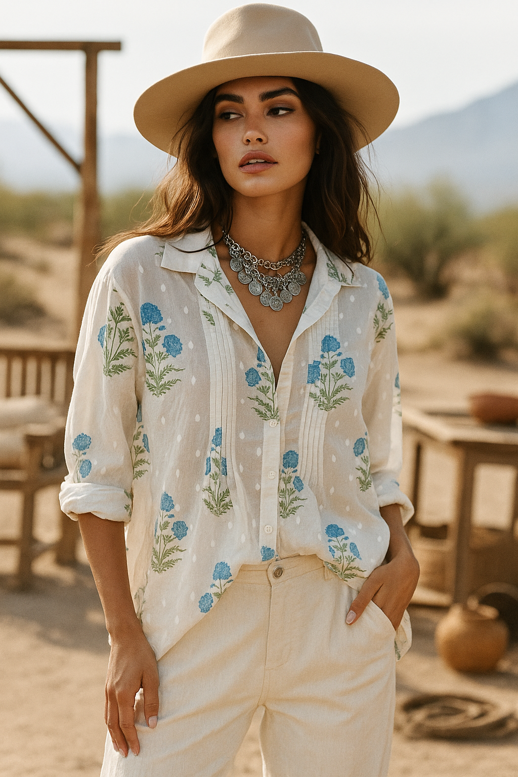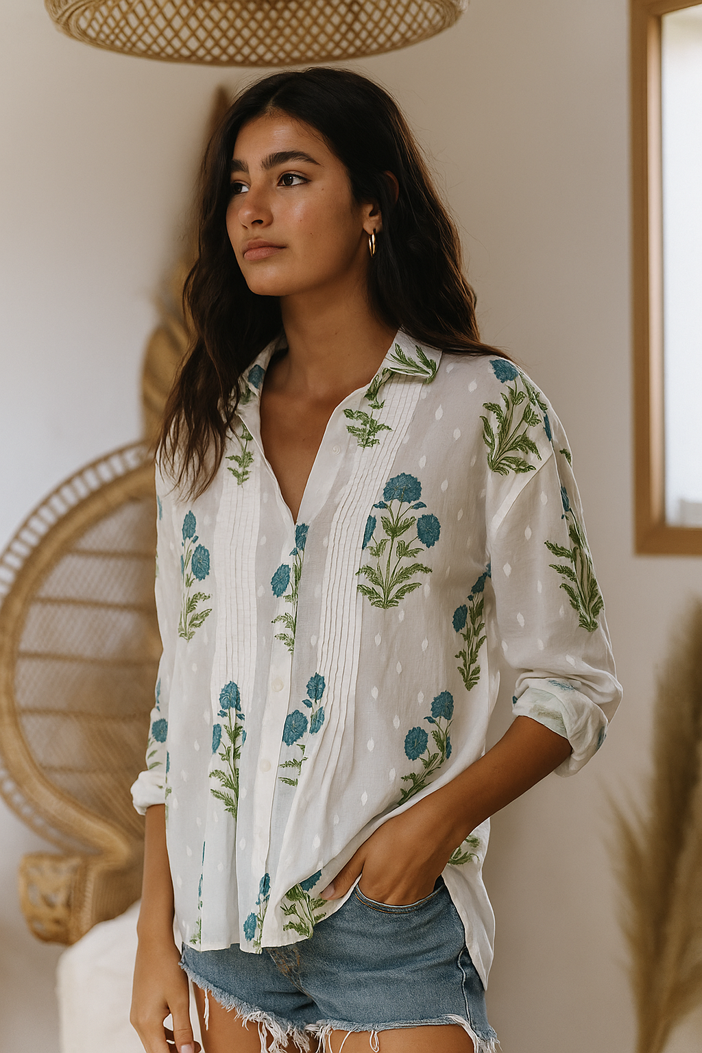 Ethereal and effortlessly chic, the Fioretta blouse captures the essence of boho-luxe living. Crafted from 100% breathable cotton, it features a delicate floral print with soft pintuck detailing and a relaxed, feminine silhouette. The airy texture and handcrafted design make it a timeless piece — perfect for pairing with vintage denim or linen trousers for that elevated, carefree look.