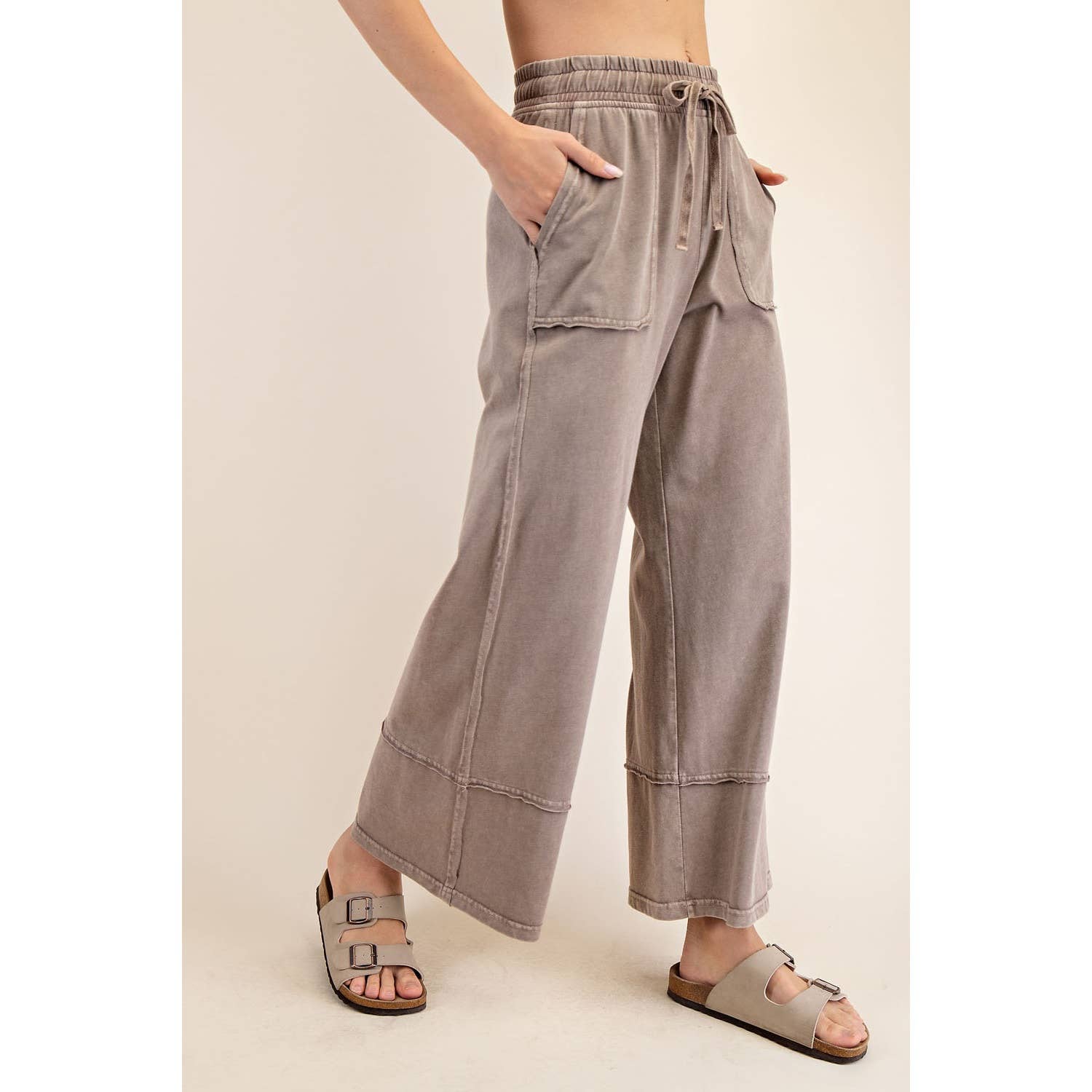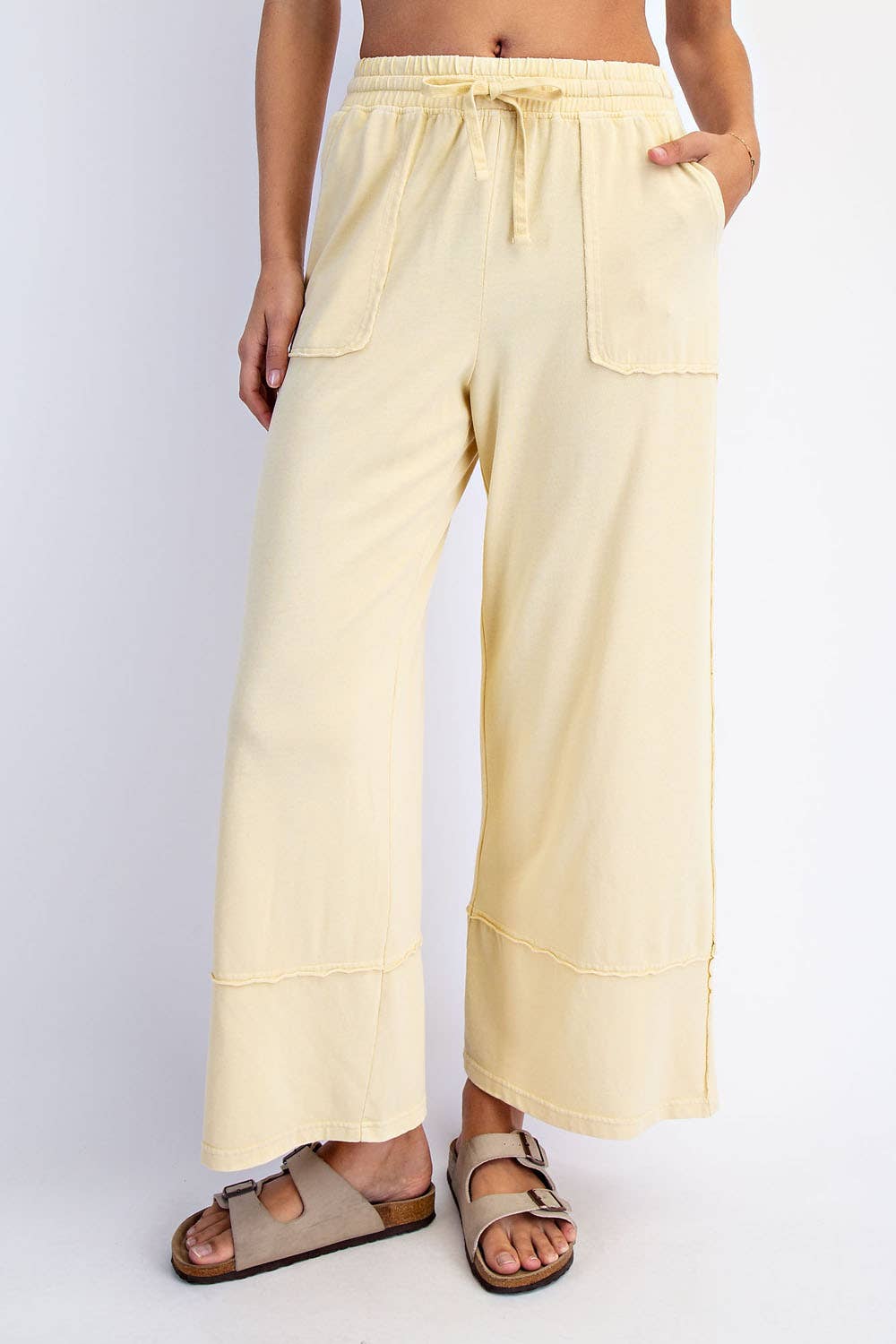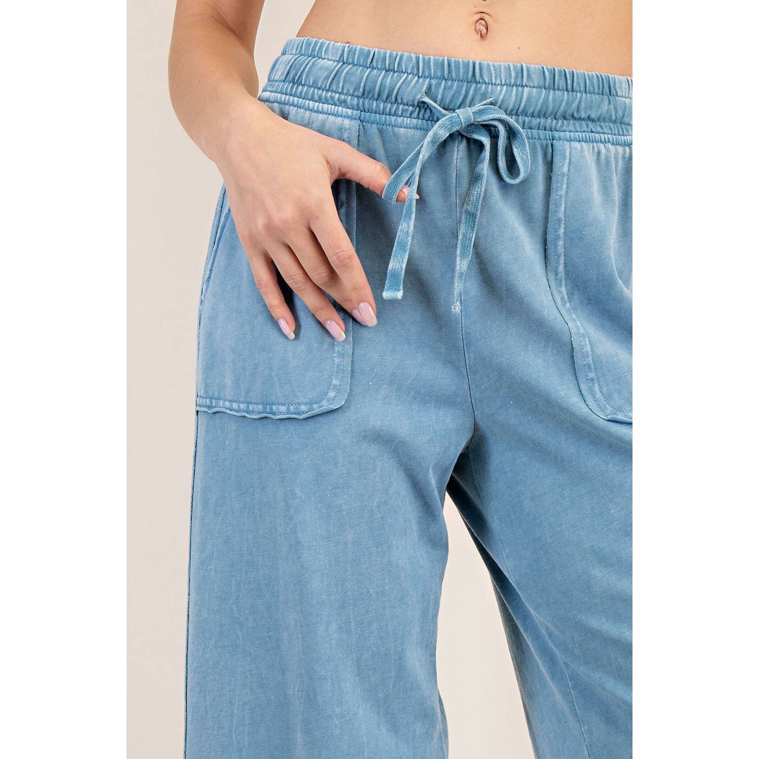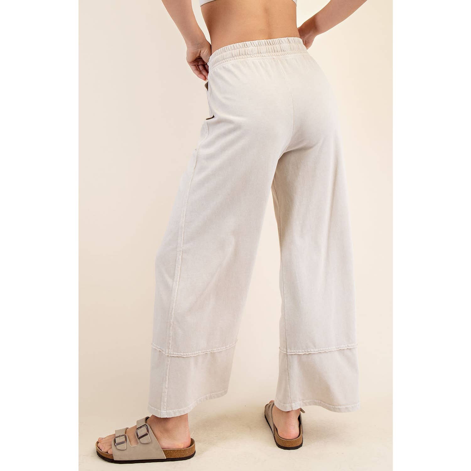 This cropped wide-leg pant is made from mineral-washed cotton fabric, offering a relaxed, vintage-inspired look. The high-waisted design and wide-leg silhouette provide a flattering, laid-back fit, while the soft, breathable cotton ensures all-day comfort. Perfect for casual outings with a chic, effortless style. Features: - Mineral washed cotton fabric - Relaxed fit - full length Wide leg - Side patch pockets - Adjustable elastic waistband - Raw edge seaming details
