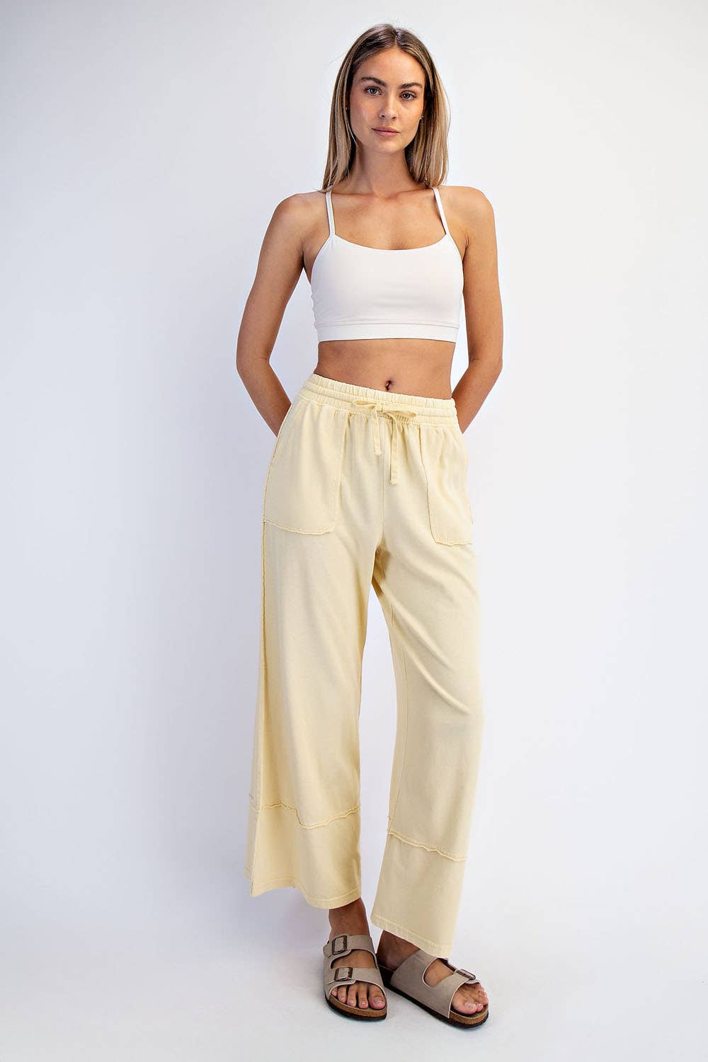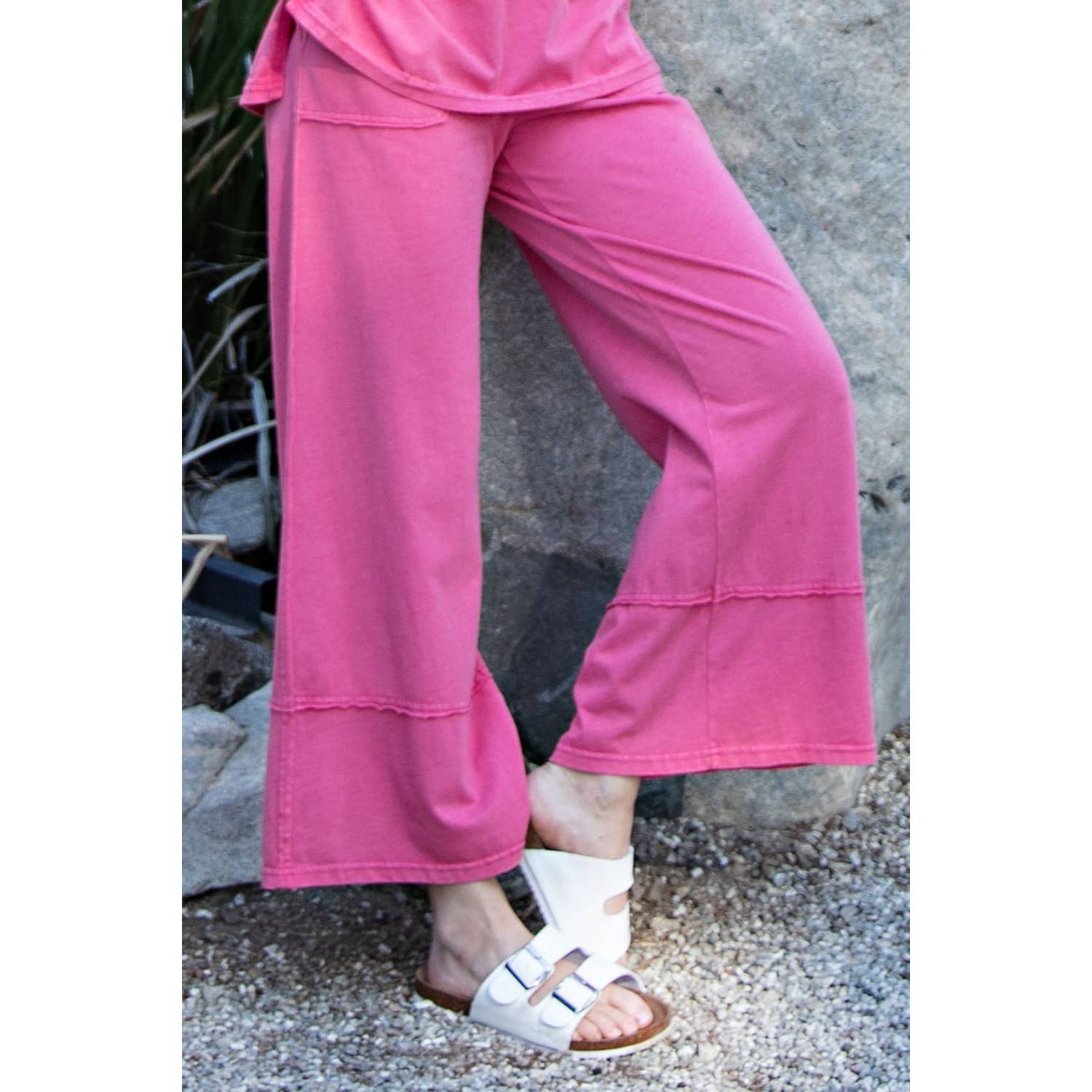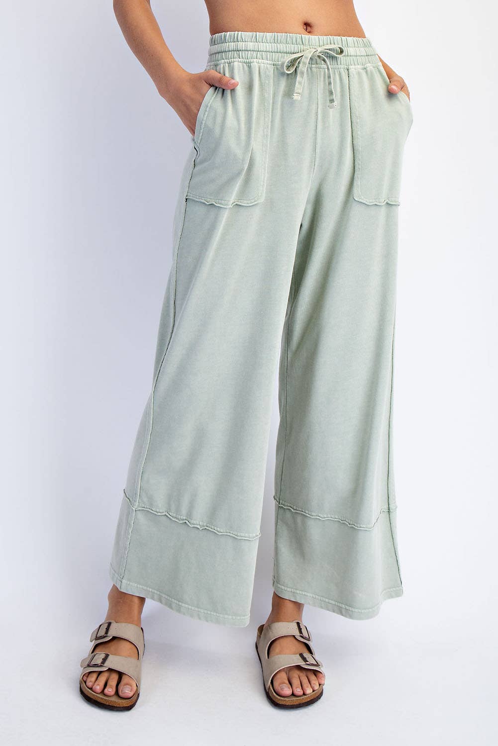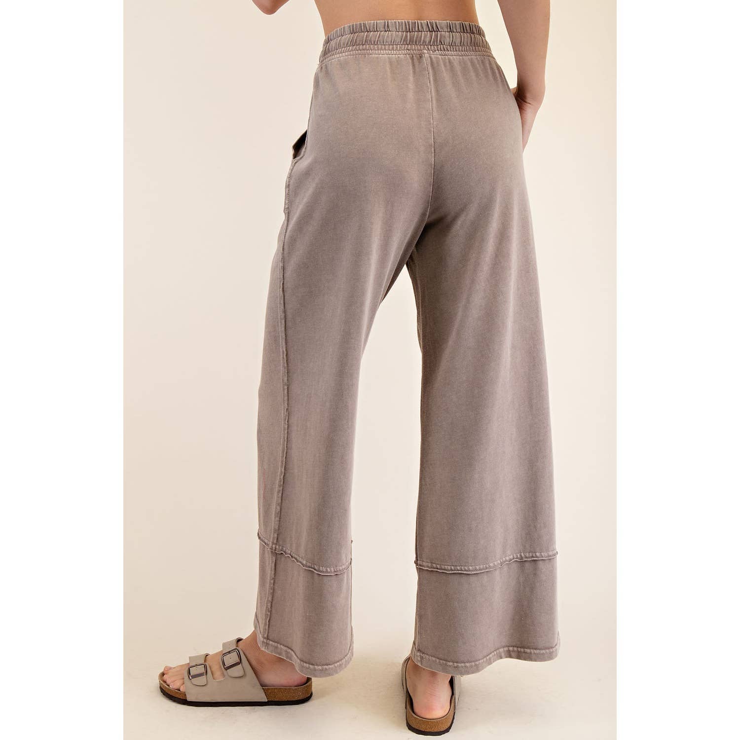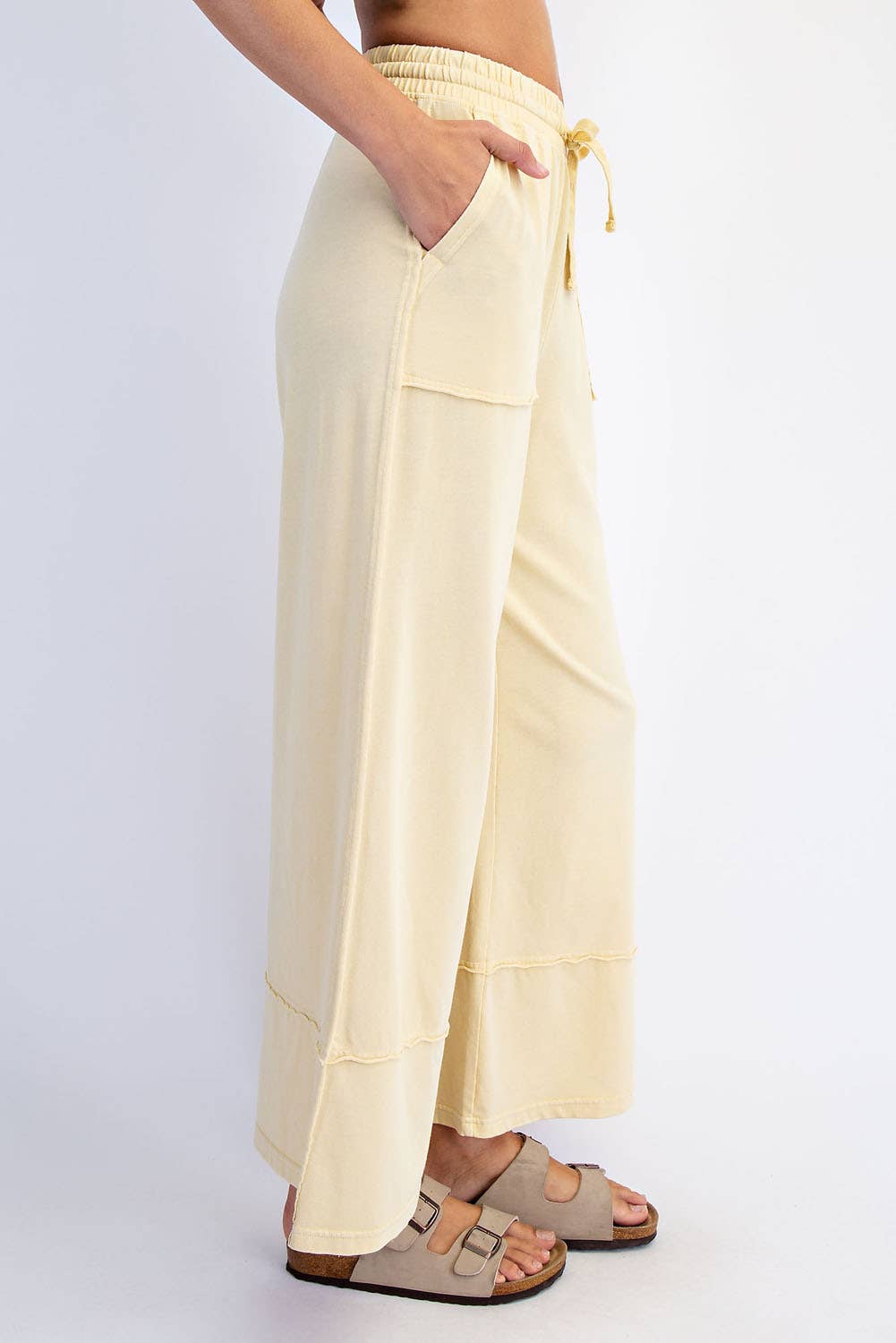 This cropped wide-leg pant is made from mineral-washed cotton fabric, offering a relaxed, vintage-inspired look. The high-waisted design and wide-leg silhouette provide a flattering, laid-back fit, while the soft, breathable cotton ensures all-day comfort. Perfect for casual outings with a chic, effortless style. Features: - Mineral washed cotton fabric - Relaxed fit - full length Wide leg - Side patch pockets - Adjustable elastic waistband - Raw edge seaming details